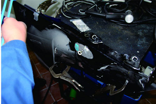 在鋁質面板修復時,也可使用鋁整形機對損傷部位進行拉伸修復,在經整形機修復到位后,使用專用工具將螺紋介子齊根剪下,再打磨平整即可。對于鋼板車身來說,當面板和內層結構同時發生變形時,可以采取內外層分離、分別修整,然后折邊咬合的修復方法。對于鋁質面板,不能使用這種方法,否則由于鋁的韌度較差,折邊部位會出現裂紋或斷裂。