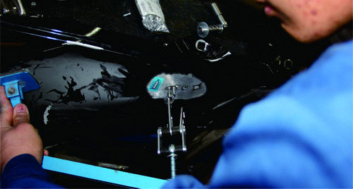 (8)相對于鋼板修復,鋁質車身板件更換的定位工作顯得更為重要。鋁質車身粘接部位的粘接膠需要較長的固化時間,為防止粘接膠在固化后車身尺寸產生位移或變動,測量后必須使用定位夾或通用夾具對更換部件進行定位。