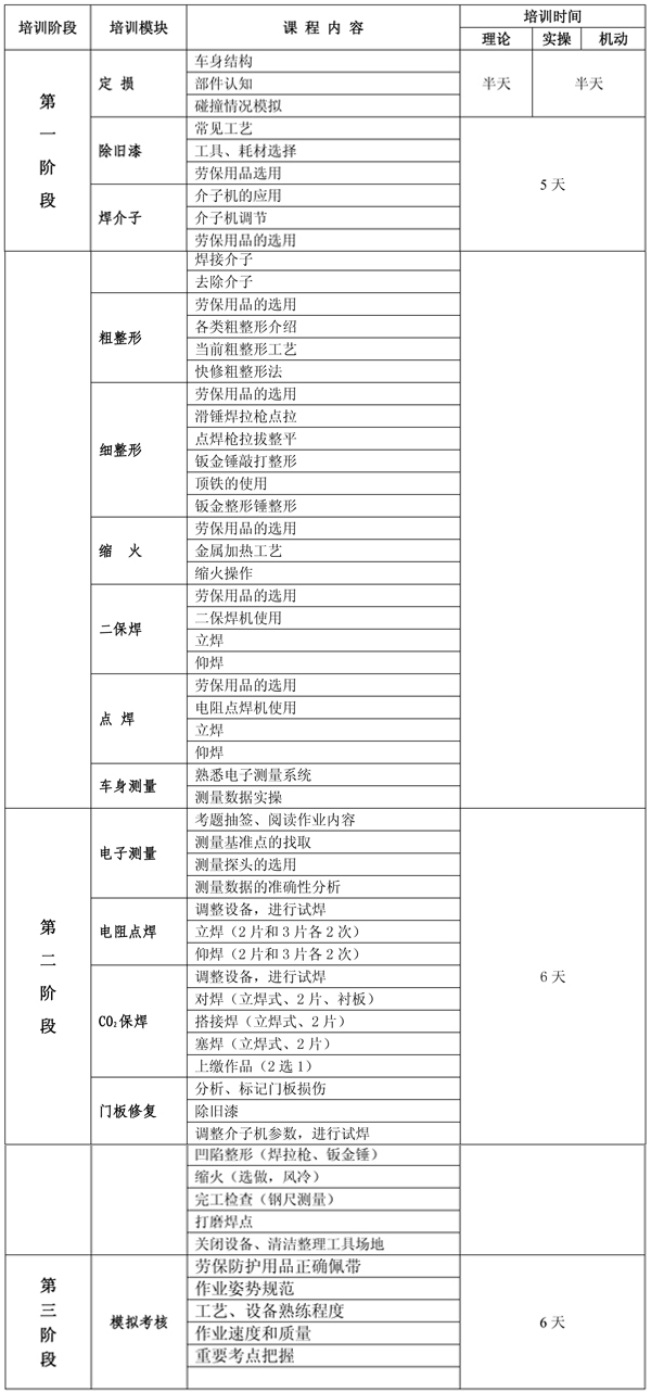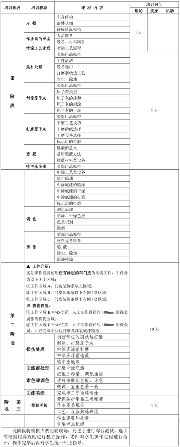 整個培訓課程分三個階段,其中第一階段先按車身修復的基本工藝驟步培訓,時間約為10天;第二階段則以競賽項目專項培訓,時間也為10天;第三階段主要以模擬大賽現場,進行綜合強化訓練。詳情見下表: