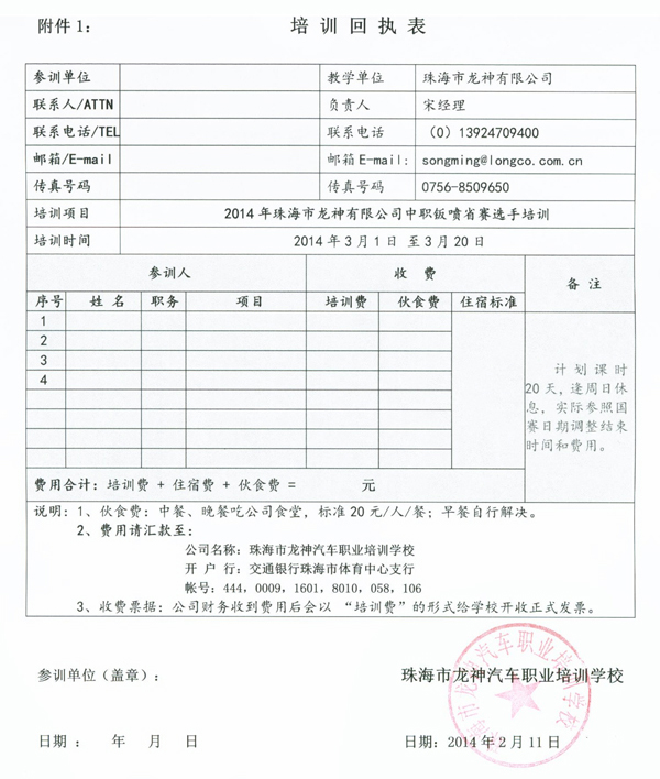 為了響應國家“企業應該積極融入和參與職業教育事業”的號召,讓部分參賽條件和設施不足的學校也能參加技能大賽,促進全國中職技能大賽在全國的快速和均衡地發展,珠海市龍神有限公司憑借自身20多年的汽車鈑噴行業經驗和設備技術優勢,定于201431日至320在珠海舉辦為期20天的汽車車身修復與涂裝技能大賽選手培訓,具體方案如下: