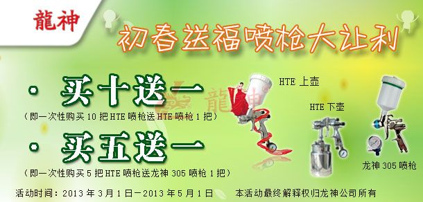 吉尼斯HTE噴槍“初春送福”促銷活動方案 2013-03-01 27763 吉尼斯HTE噴槍“初春送福”促銷活動方案 (產品編號:30282000-30286000) 2013年3月份市場促銷方案如下:一、主題:“初春送福”噴槍大讓利。二、活動時間:1、 時間:2013年03月1日至2013年05月1日 2、 時長:共計2個月 三、活動內容:1、 買十送一(即一次購買十把HTE噴槍送一把HTE噴槍)2、 買五送一(即一次購買五把HTE噴槍送一把龍神305噴槍)四、具體操作方案 1、購買十把HTE噴槍送一把HTE噴槍 2、買五把HTE噴槍送一把龍神305噴槍 (以上二個方案具體促銷方式可按增量的形成搭配)