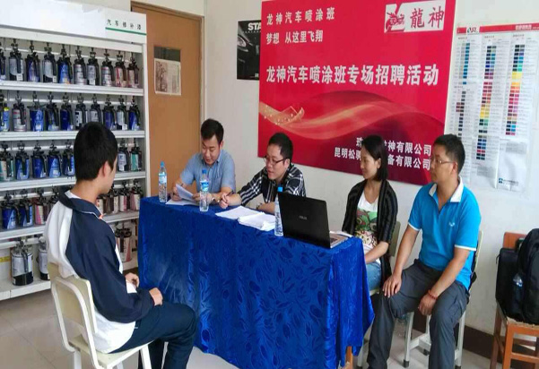 珠海龍神有限公司攜手昆明松騁汽修設備有限公司與昆明市官渡區職業高級中學建立更深層次的校企合作關系,開辦龍神噴涂班。現場選拔面試會已于2014年6月24日在昆明市官渡區職業高級中學隆重舉行!